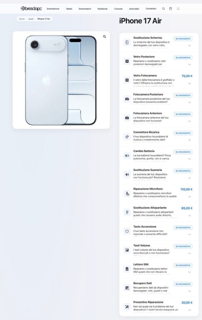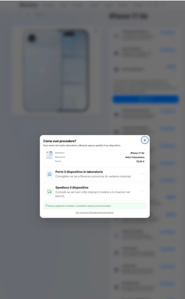 Cerca il modello del tuo dispositivo dalla home, dal menu o dalla barra di ricerca. Identifica la riparazione di cui hai bisogno (es. sostituzione display, cambio batteria). Se non trovi un prezzo esposto, richiedici una quotazione aggiornata e senza impegno.